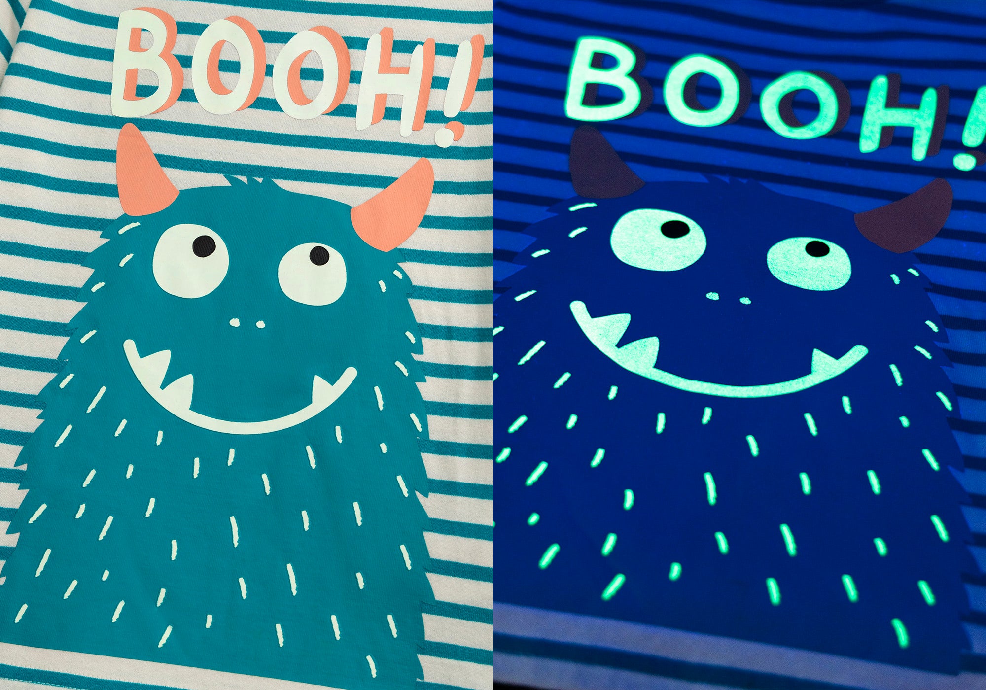 Kurzes phosphoreszierendes Pyjama mit Streifen und "Lustigem Monster"-Motiv für Jungen